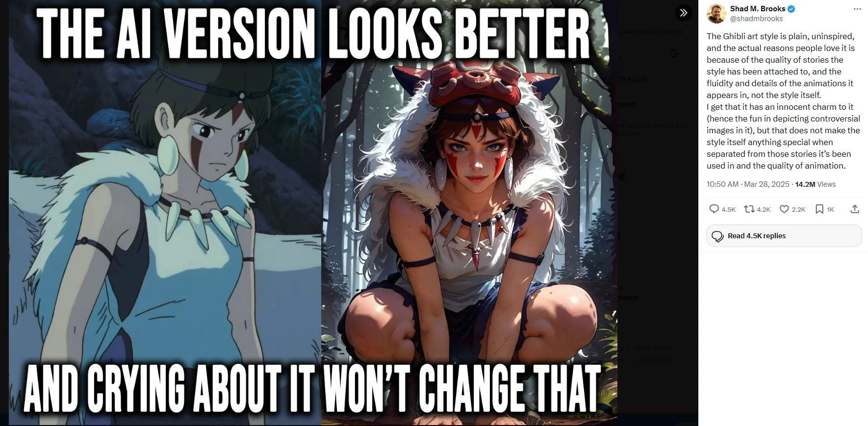 What we get after the death of artistic intent is actually the machinic reality. Or rather, the reality of those who built and support the machine. It is no surprise that those most in favour of AI-generated slop are grifters who use AI to nudify women on Twitter and like videos by influencers who tell their young audiences that feminism is destroying society. They’re also the ones most likely to say completely ass-backwards things like this.